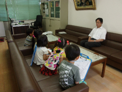 6月13日(金)1年生がグループに分かれて、自分たちだけで学校を探検しました。校長室に入って、上手に校長先生にインタビューしていましたが、終わった後「緊張した。」と言っていました。