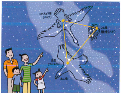夜空に目を向けると、一際まぶしく輝く星があります。織姫と彦星です。織姫は琴座の『ベガ』、彦星は鷲座の『アルタイル』という一等星です。この二つに白鳥座の『デネブ』を加えて、「夏の大三角」と言います。今年「夏の大三角」が最も見えるのは、7月13日(金)と8月11日(土)の二日間です。ぜひ、夜空を見上げて織姫と彦星を見つけてみましょう。