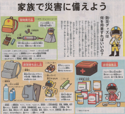 9月5日(水)880万人訓練に合わせて、地震・津波を想定した避難訓練を行います。災害は、いつ、どこで発生するか分かりません。各ご家庭でも災害への備えをすることは大切です。そこで、8月29日付の毎日小学生新聞に家庭での備えをイラスト付きで紹介されていましたので、参考にしてみてはいかがでしょうか。