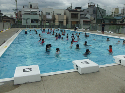 7月9日(水)4年生が着衣水泳をしました。いつものように水慣れをした後、水着の上から服を着て水に入った子どもたち。「服がひっつく!」「わぁ 重い!」と大騒ぎでしたが、ペットボトルを抱いても浮くことができる体験をしました。いざというときは、できるだけ体力を温存して救助を待つことが大事と学習しました。