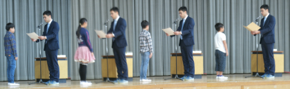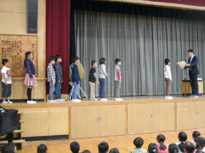 10月15日 夏休みに受検した漢字検定の最優秀賞、優秀賞、努力賞、咲くやこの花館主催のスケッチコンクールでの優秀賞の表彰をしました。