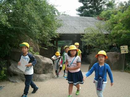 10月18日 天王寺動物園に行ってきました。サバンナゾーンでは班の友だちと地図を見ながらオリエンテーリングをして、ライオンやキリンなどの動物を見ました。昼食後も、みんなでたくさんの動物を見て回りました。帰校後に書いた絵日記では、こうもりの絵を描いている子が多くて驚きました。こうもりの逆さに止まる姿やえさを食べる様子が印象に残っていたようです。