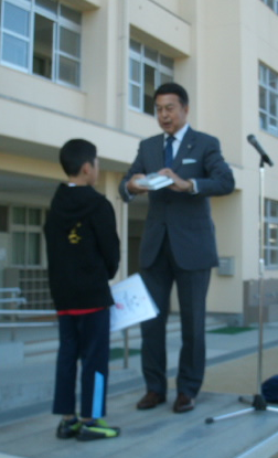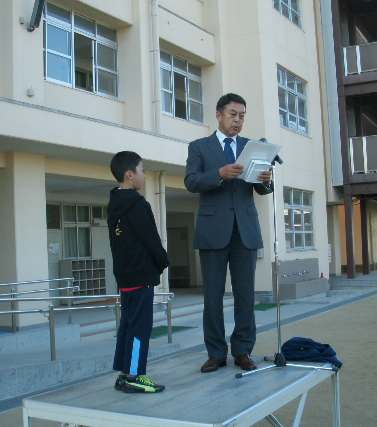児童朝会で5年生馬場俊輔さんが表彰されました。8月に行われた「全国JOCジュニアオリンピックカップ夏季水泳競技大会」において2種目(フリーリレー・メドレーリレー)で銀メダルを獲得した功績によります。おめでとうございます!