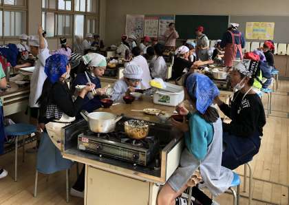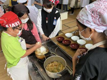 11月末 ご飯とおみそ汁を作りました。総合学習で育てたお米を混ぜ、班で協力して火加減を調節しながら炊き上げました。出来上がりを楽しみにしながらご飯が炊ける様子を観察し、炊き上がったご飯を見て思わず「おいしそう!」と言っていました。みそ汁の具は、切り方を確認しながら丁寧に切りました。おみそ汁は残さず、ご飯はおこげまでおいしく食べました。