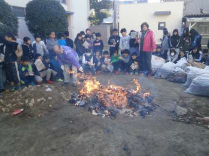 秋に収穫した稲わらでリースを作り、今回は焼いもに挑戦しました。保護者の方にもみ殻などを提供していただいたり、管理作業員さんに落ち葉を集めていただいたりして、昔ながらの方法で作ることができました。子どもたちは火がつく様子を興味深く観察したり、出来上がった焼いもに舌鼓を打ったりして充実した活動となりました。
