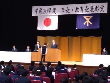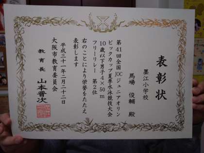 22日 東成区民センターにて市長・教育長表彰式が行われました。スポーツや芸術部門などで努力し素晴らしい功績を挙げられた大阪市内在住の幼稚園から小・中・高校生たちが選ばれました。本校からは馬場俊輔さんが表彰されました。昨夏、開催された「第41回全国JOCジュニアオリンピックカップ夏期水泳競技大会10歳以下男子4×50mフリーリレー」第二位の功績によるものです。