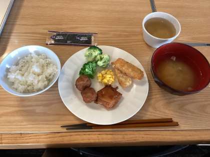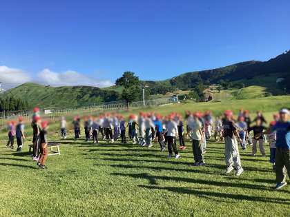 元気いっぱいにジャギー体操をしました。今日は左に見える高丸山山頂を目指してのハイキングです。朝から「おかわり!」の声がたくさん聞こえてきました。部屋では旅の思い出をはがきに書いています。みんなとっても元気です。