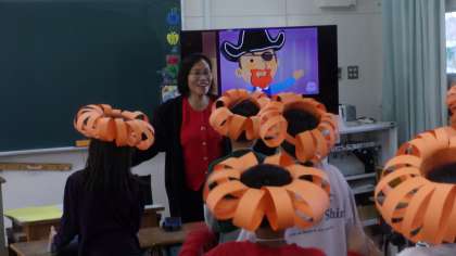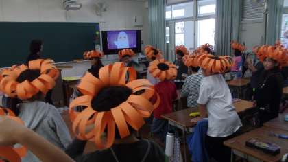 手作りのパンプキン帽子をかぶって、ニルファ先生と英語を使いながら楽しく学習することができました。