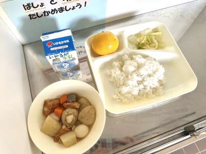 〈献立〉関東煮(卵除去)・はくさいの甘酢あえ・みかん・ごはん・牛乳