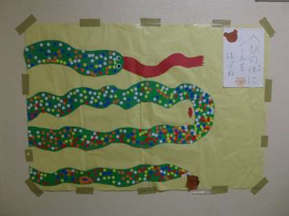 よいあいさつをしてもらったシールをみんなで貼り、へびの絵ができました。