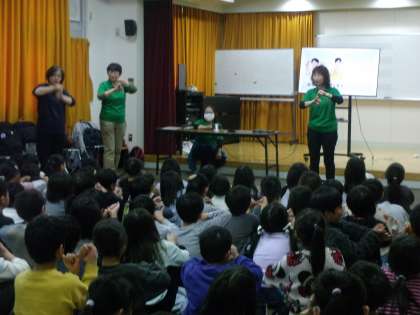 2年生は今日3時間目に、手話教室の出前授業で手話の学習をしました。住吉区手話サークル杉の子さんに来ていただき、手話でのあいさつやありがとう、ごめんなさいを教えてもらいました。また簡単な言葉の手話での表し方も教えてもらい、すぐに覚えて使っていました。