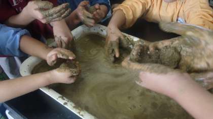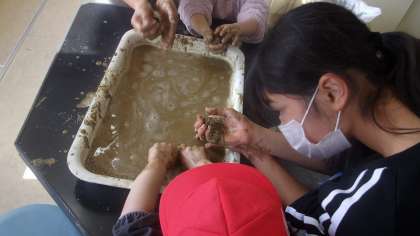 5年生が墨江幼稚園の皆さんと一緒にどろだんご作りをしました。みんな素敵な笑顔で楽しく活動できました。
