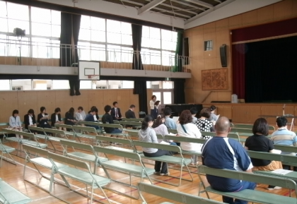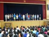 児童朝会で今年度の前期代表委員の児童が、全校にあいさつをしました。前期代表委員...