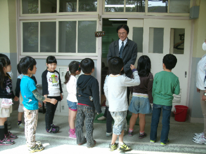 4月17日(木)1年生が、学級単位で学校を回りました。校長室前では、校長先生に...