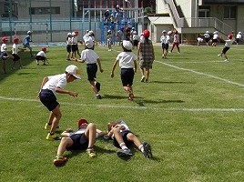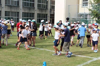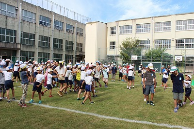 9月12日(金)子どもたちが初めて、芝生の運動場を踏みしめました。夏休みもずっと辛抱して待ちわびたこの日、ふわふわの運動場の上で、みんなでじゃんけん列車をしました。休み時間には、寝ころんだり追っかけっこをしたりと、存分に芝生の感触を楽しんで大喜びでした。