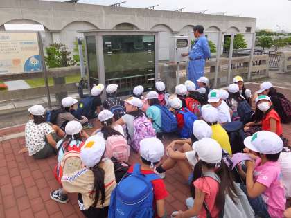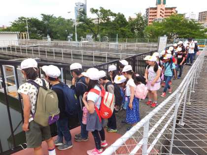 4年生は、5月31日(金)に柴島浄水場へ社会見学に出かけました。淀川から取水したばかりの水が、プールのような沈でん池でかくはんされたり、薬品を投入されて汚れが凝固することによって徐々に透明できれいになっていく様子をしっかり見学することができました。