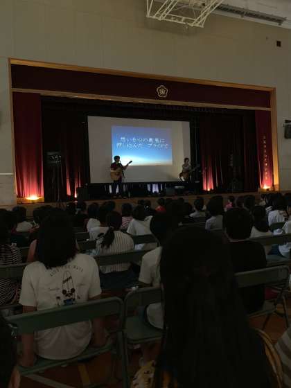 7月9日(火)に山之内小学校で大和川中学校・山之内小学校・遠里小野小学校の三校合同のPTA人権教育講演会が開催されました。講師は『ちめいど』という兄弟二人のデュオで“今を生きるひとりひとりが名主役”〜ひとりを大切にすれば夢は叶う〜というタイトルでした。PTAの活動ですが、この講演会に、遠里小野小学校の6年生が招待を受けて、山之内小学校の6年生と一緒に参加させていただきました。映像を駆使したライブで、生きることの素晴らしさ、生命の大切さを感じることができる感動的な講演会でした。6年生の子どもたちもきっと心に響いたことと思います。また山之内小学校の子どもたちと同じ場所で同じ感動を味わうことができたのはよい経験になりました。