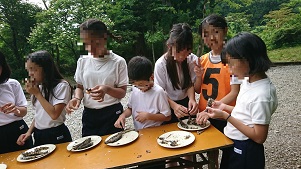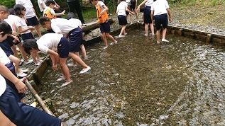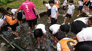 14:00、1日目の活動が始まりました。まずは魚つかみ。まわりは暑いですが、川の水はとびきり冷たく、水に入ると涼しくなりました。魚はぬるぬるしていて、つかむのに悪戦苦闘する子もいました。