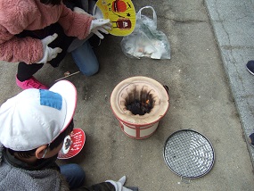 七輪は、社会見学で行った「くらしの今昔館」で見たことはありますが、実際に使ってみるのは初めて。班のメンバーで交互にうちわをあおいでいました。
