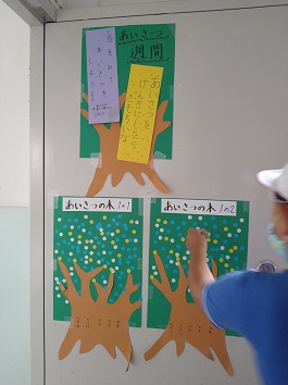 9月14日〜9月18日はあいさつ週間です。自分から進んであいさつをしようという目標で取り組んでいます。代表委員の子どもたちが朝の登校時と2時間目が終わった15分休憩に玄関付近に立って、進んであいさつをした子どもたちにシールを渡しています。シールをもらった子どもたちは、教室前に掲示したあいさつの木に貼り付けていきます。シールがたくさん集まると華やかな木になるので子どもたちは競って一生懸命にあいさつをしています。あいさつ週間の取り組みがよい習慣につながることを願っています。