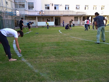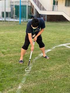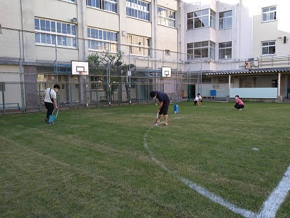 運動会に向けて、教職員みんなで運動場にトラックのラインを引きました。冬芝の養生期間が終わり、青々とした芝生に白いペンキがとてもきれいです。