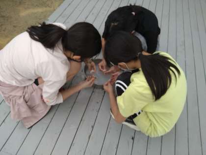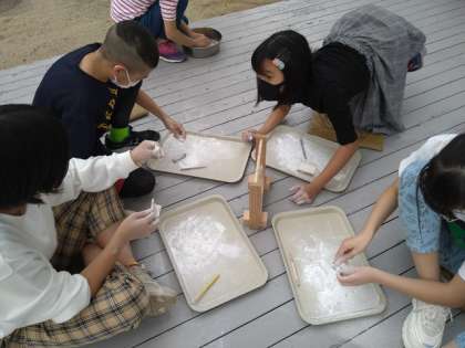 最後に池上曽根弥生学習館に行きました。ここでは勾玉作りをしました。L字型の石に出来上がりをイメージした線を引き、紙やすりを使って削っていきます。鉛筆に紙やすりを巻いて丸いところも上手に削っていきました。水の中で磨いて出来上がりです。