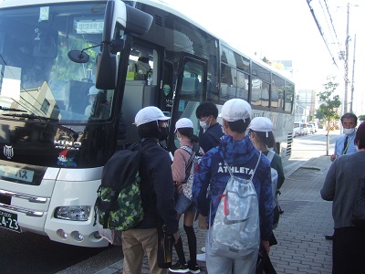 出発式のあと、手を消毒して2台のバスに乗り込みました。
