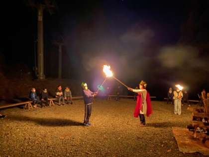 火の神さまから「知恵」「団結」「友情」「勇気」の火をもらい、薪に火を灯します。