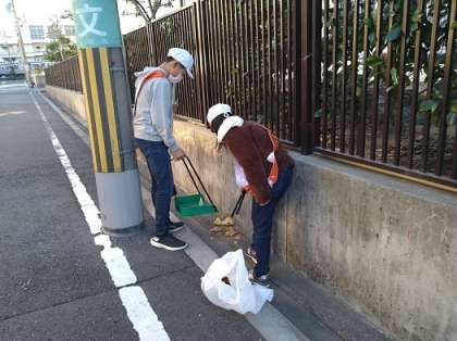 代表委員会の子どもたちは、朝、校門のところに立って、登校してくる子どもたちに「おはようございます」のあいさつをしています。それに加え、冬に向かい、大量に舞い散る落ち葉やごみをほうきで掃いたり、火ばさみを使って拾ったりして、校内や学校周りをきれいにしてくれています。