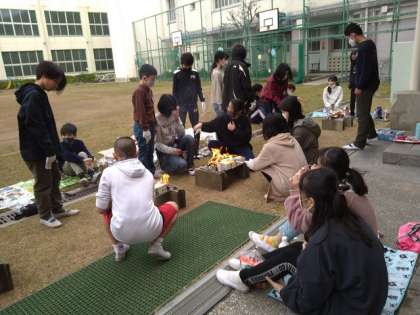 1時間目は大なわの記録更新に挑戦。2000回が目標だそうですが、記録は368回でした。まだまだこれからです。ドッジボールも楽しみました。2時間目は学校の校舎を使用してのかくれんぼ。ビブスをつけた鬼が次々と見つけていきます。立ち入っていいところは限られているのですが、最後まで見つけられなかった強者もいました。3時間目はカートンドッグづくりをしました。パンにウインナーやチーズをはさみ、アルミホイルで巻いたものを牛乳パックに入れて火をつけます。牛乳パックが焼け落ちる頃にはおいしいホットドッグの出来上がり。全員出席で、よい思い出作りができました。