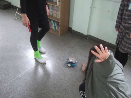 今回は、「物体に近づいたら止まる」というプログラムを組んでロボットにインストール。人感センサー(超音波センサー)の前に手をかざしたり、足(身体)を置いたりして、まっすぐ走ってきたロボットが指定した距離より近づくと、プログラム通り止まったり、物がなければまた走り出したりすることを確かめました。