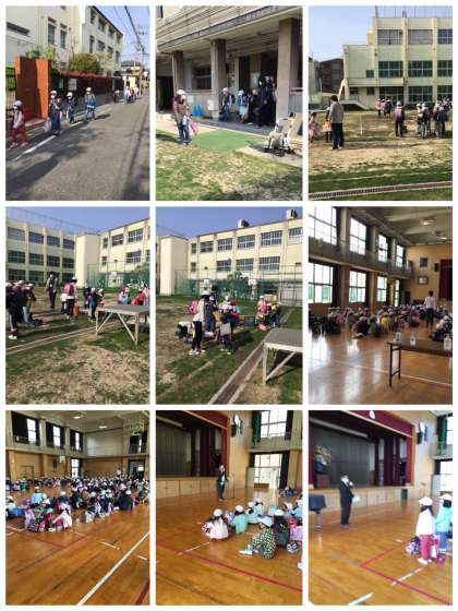 朝、元気に集団登校した児童は、運動場で健康チェックを行い、1年生は教室に、その他の学年は体育館に移動しました。