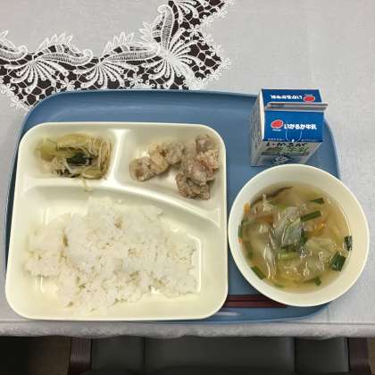 鶏肉の唐揚げ 中華スープ チンゲン菜ともやしの甘酢あえ ごはん 牛乳