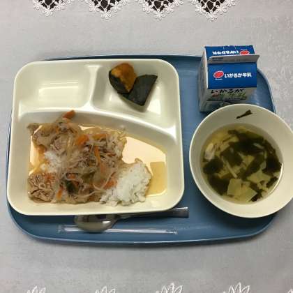 豚丼 湯葉のすまし汁 かぼちゃの醤油焼き 牛乳
