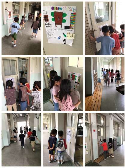 学校の各部屋には、案内の絵とクイズが書かれたポスターが貼られ、その横には、シールが用意されています。