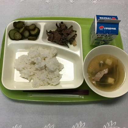 プルコギ 豆腐のスープ きゅうりの甘酢づけ ごはん 牛乳
