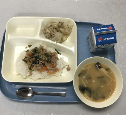 豚ひき肉とにらのそぼろ丼 みそ汁 キャベツの赤じそあえ ごはん 牛乳