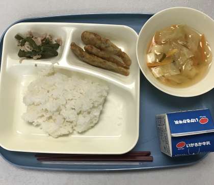 いわしの天ぷら 五目汁 豚肉と三度豆の炒め物 ごはん 牛乳