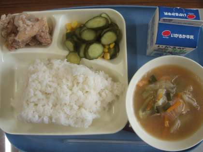 鶏肉のからあげ 中華みそスープ きゅうりとコーンの甘酢あえ ごはん 牛乳
