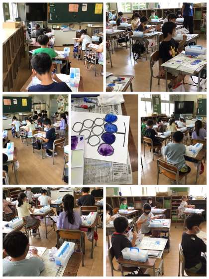 5月13日(火)、2年生が絵の具を混ぜて新しい色を作る練習をしていました。ぶどうの形に区切った枠に最初は青色を塗って、少しずつ赤色を混ぜながら、微妙に変化させていました。ぶどうの枠は、だんだんときれいな色が塗られ、甘酸っぱそうなぶどうになっていきました!!