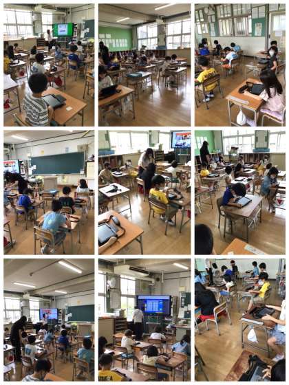 9月15日(水)、1年生がタブレット端末のインターネットで「秋の虫」を調べていました。まだ、操作に慣れない児童もいるので先生が大きなモニターを使って、ゆっくりと調べる画面まで導いていきました。自分でできる児童は、うれしそうにできない児童を教えてあげていました!!