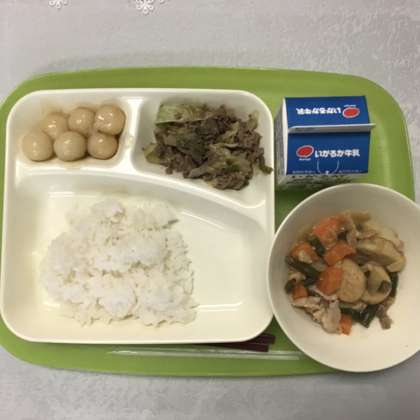 一口ガンモと里芋のみそ煮 牛肉と野菜の炒めもの みたらし団子 ごはん 牛乳