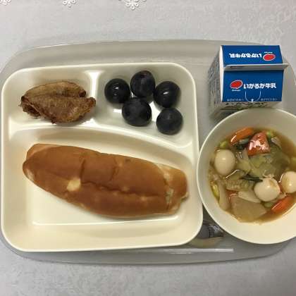 揚げギョウザ 中華煮 ぶどう(巨峰) おさつパン 牛乳