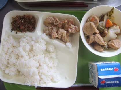 ごはん 牛乳 鶏肉のたつたあげ 一口がんもと野菜の煮もの おかかなっ葉