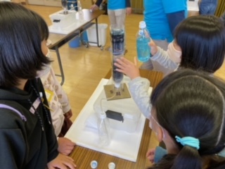 そのあと実際に水をろ過する実験を行いました。担当の方の話をしっかりと聞いて、土で濁った水をきれいにろ過することができました。匂いの残った水もろ過することで匂いがない水にすることができました。