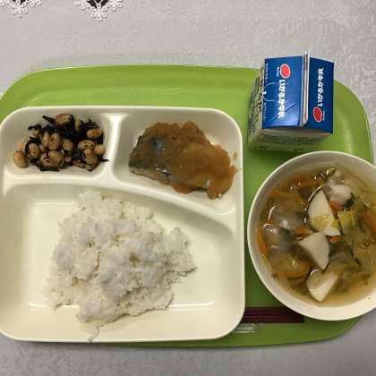 さごしのおろし醤油かけ 里芋のすまし汁 大豆の煮物 ごはん 牛乳