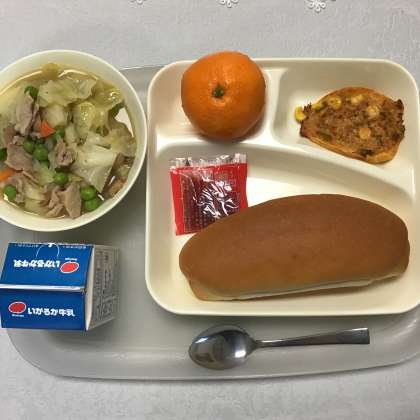 豚肉と野菜のスープ煮 変わりピザ みかん コッペパン・いちごジャム 牛乳