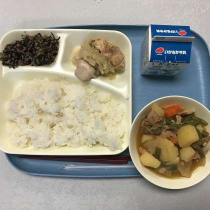 鶏肉の柚子塩焼き 含め煮 魚ひじきそぼろ ごはん 牛乳