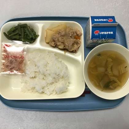 変わり肉じゃが 鶏肉と白菜のすまし汁 三度豆の胡麻和え ごはん 牛乳