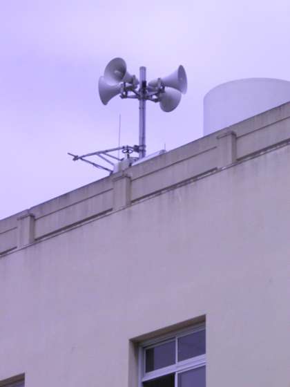 (写真左は、校舎の上に設置されている同報無線です。実際の災害時にもここから地域に放送が流されます。)